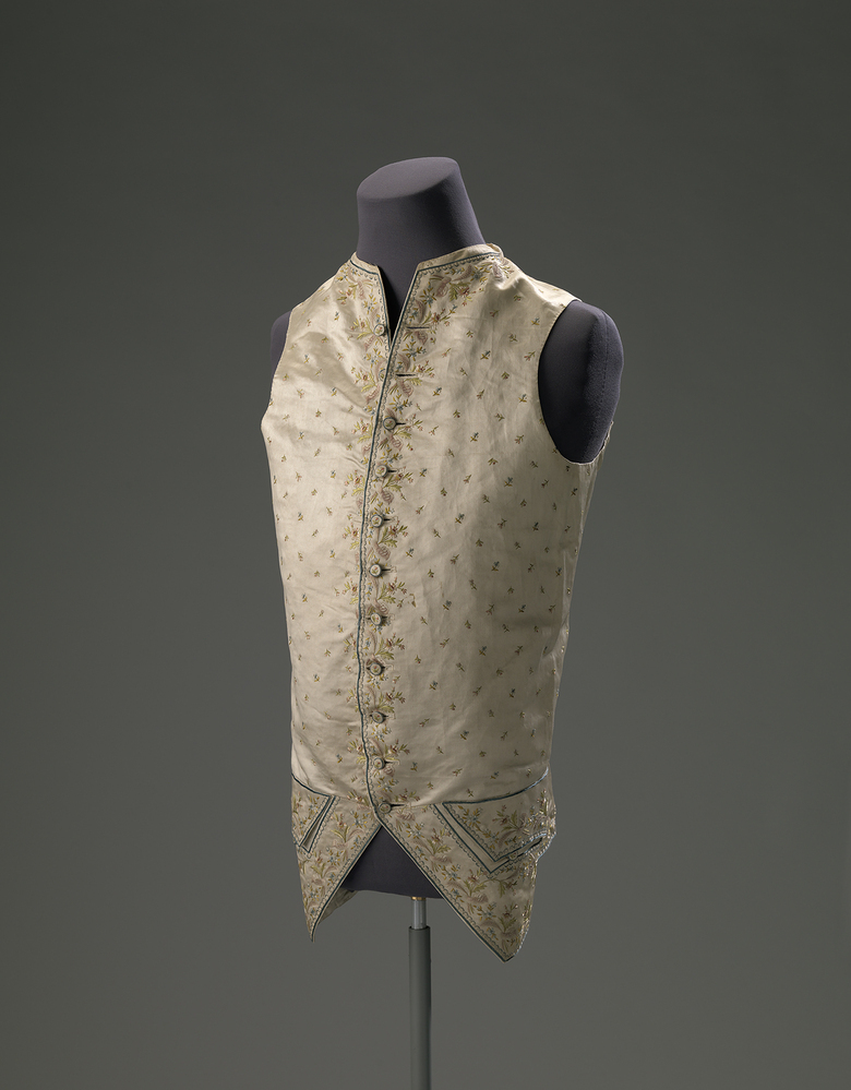 Het vest is versierd met zijdeborduursel in pasteltinten en toont een strooimotief van bloempjes. Langs de randen en op de zakkleppen zijn bloemboeketten geborduurd. Dergelijke fraai uitgevoerde herenvesten behoorden tot de laatste 18de-eeuwse frivoliteiten op het gebied van de mannenmode. Na 1800 zouden effen stoffen en donkere kleuren het modebeeld gaan bepalen. ( Bert Vreeken)