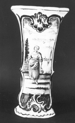 beker van een 5-delig kaststel. Vrouw met mandje bij een meer met zeilschip- Trefwoorden