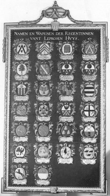 Dit bord met de familiewapens en namen van de ‘regentinnen’ hing in de regentessenkamer. Steeds wanneer iemand aantrad werd het wapen erbij geschilderd. Toen het doek vol was, is het aan de onderzijde uitgebreid. Door de opheffing van het Leprozenhuis in 1859 zijn de laatste vakken leeg gebleven. ( Norbert Middelkoop)