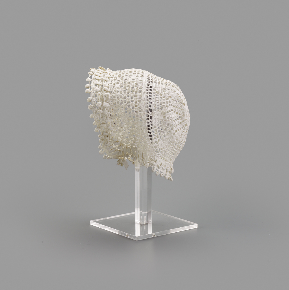 Gehaakte witte katoenen babymuts, met twee banden om dicht te strikken onder de kin.- Trefwoorden
