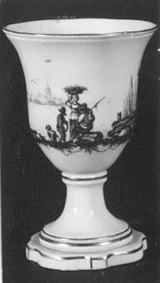 De beker voorzien van een 'encre de Chine' beschildering met een gezelschap aan een rivierover met op de achtergrond een stadje met kerk en gebouwen.- Trefwoorden