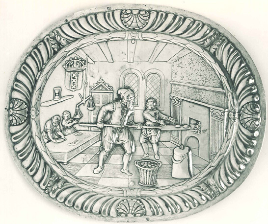 Ovale plaat met een medaillon waarin een gedreven, gegraveerde en deels geponste voorstelling van het interieur van een broodbakkerij. Op de voorgrond een bakker, met een schieter broodjes in een oven stekend. Achter hem een hulpje en twee figuren achter een werktafel, een man deeg knedend en een vrouw broodjes wegend. Voorts een mand met broodjes, een doofpot en een plank met een zandloper. Linksboven het gekroonde wapen van Amsterdam. Rand samengesteld uit een lauwerkrans en knorren, alternerend met vier schelpen en vier acanthusbladeren.- HerkomstCollectie W.J.R. Dreesmann, Amsterdam, voor 1949; vlg. W.J.R. Dreesmann, Amsterdam (Frederik Muller), 22/25-3-1960, nr. xxx.