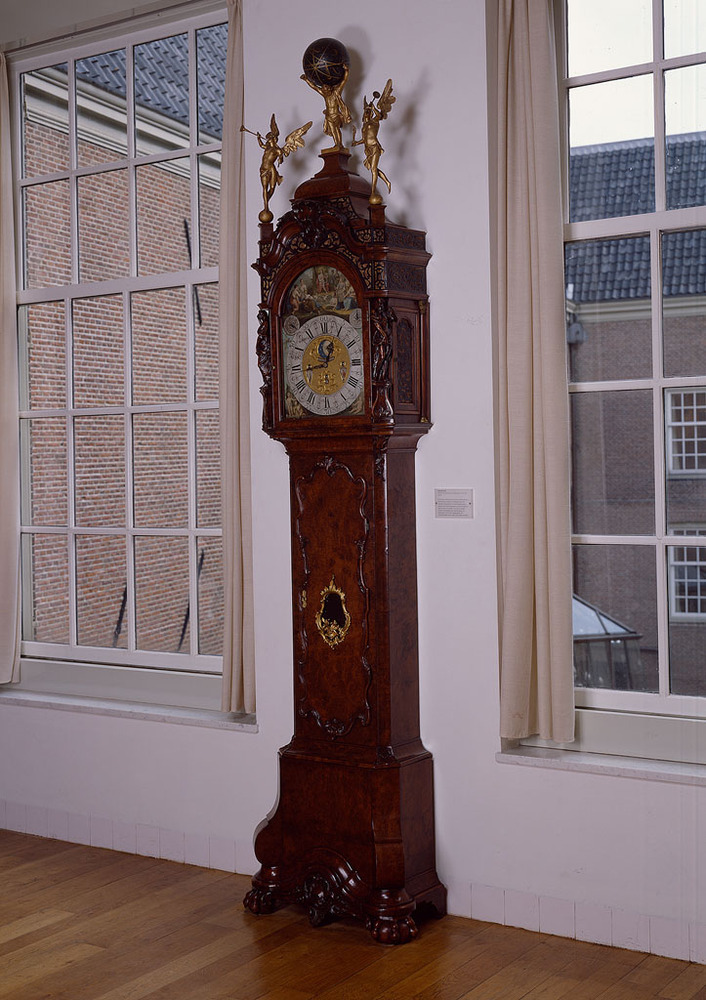 De maker van deze klok, Gerrit Knip, werkte omstreeks 1750 als klokkenmaker in Amsterdam. Klokkenmakers genoten een algemene bekendheid en behoorden tot de rijkere ambachtslieden, mede omdat ze vaak een internationale klantenkring hadden. Toen de huisklok een wezenlijk deel van het meubilair werd, begon de klokkenmaker zich ook meer te richten op de bouwvorm, stijl en mode. In Amsterdam kwam hierbij het marquetterie- of inlegwerk tot grote bloei. ( Jacqueline Grandjean)