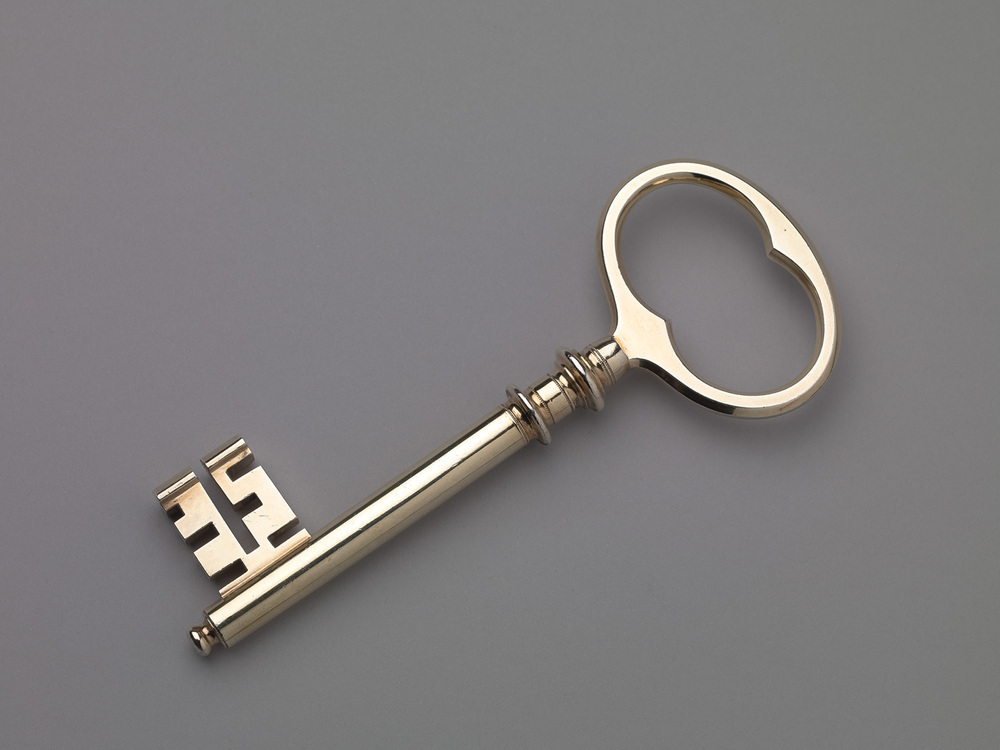 Sleutel met oog, pijp en baard. Zevenzijdig ovaal oog, binnenzijde in vorm van een tweepas. Cilindrische pijp met geprofileerde nodus en schijf tussen geribde randen. Pijp eindigend in afgeplat knopje. Baard met asymmetrische inkepingen, de ene recht, de andere gebogen.