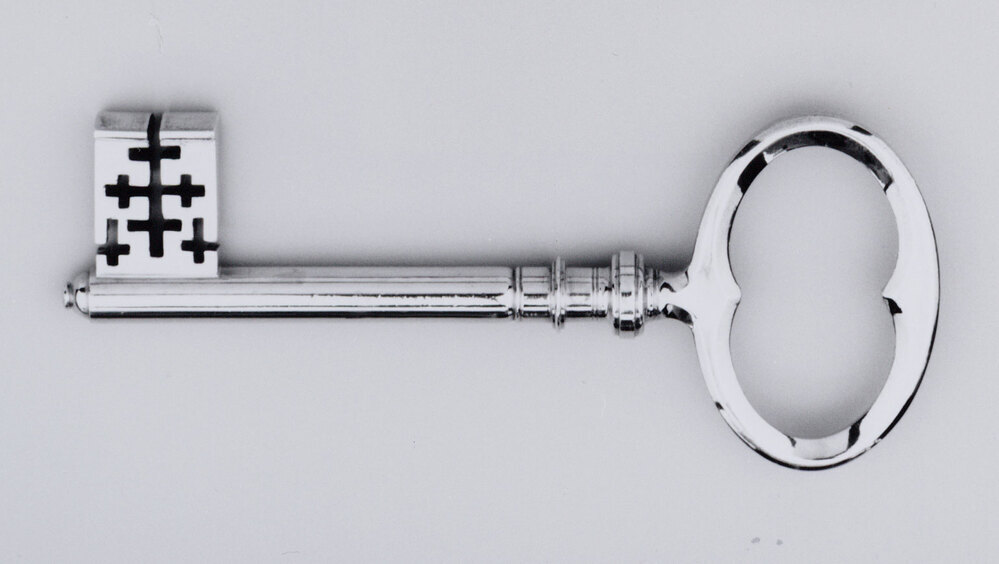 Een van twee verschillende sleutels. Deze sleutel heeft ovaal achtzijdig oog, de binnenzijde in de vorm van een tweepas. Cilindrische pijp met geprofileerde nodus en schijf tussen filetranden. Pijp eindigend in afgeplat knopje. Rechte baard met symmetrische inkepingen.