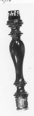 Balustervormig, meervoudig geprofileerd ebbenhouten stokje met een breed en een smal uiteinde; het laatste gevat in een gegoten zilveren dop. De cilindervormige dop heeft een rechte, gladde wand met een vlakke, iets uitstekende bovenrand en een door een enkele filetrand gemarkeerde onderzijde. Op de lichtgebolde bovenzijde zijn binnen een sierrand in monogram de letters: MKRS/(MaKelaaRS) gegraveerd. De zilveren dop van het brede uiteinde ontbreekt.