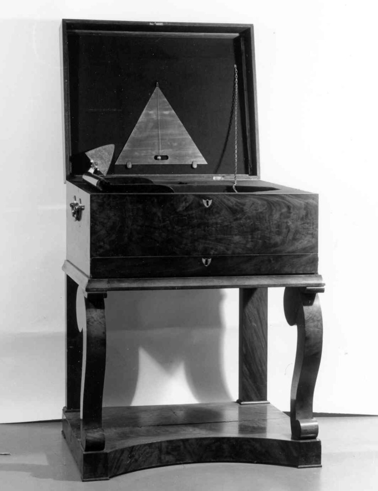Het gereedschap maakt deel uit van een omvangrijk ensemble, dat is geborgen in een mahoniehouten meubel in late Empire-stijl. (afb. Xa) Het onderste gedeelte van de kist bevat een lade waarin verschillende documenten met betrekking tot de eerste steenleggingen van de Wester- en Oosterdoksluizen worden bewaard.