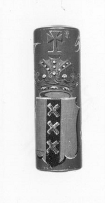 Cilindervormig staafje hout, bruingeschilderd. Aan twee zijden het gekroonde wapen van Amsterdam.- Trefwoorden