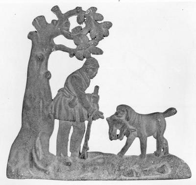 gietijzeren versiering: links een boom, waarbij een jager met een geweer in de linkerhand, de rechterhand strekt hij uit naar een hond, die een geschoten haas in zijn bek draagt- Trefwoorden