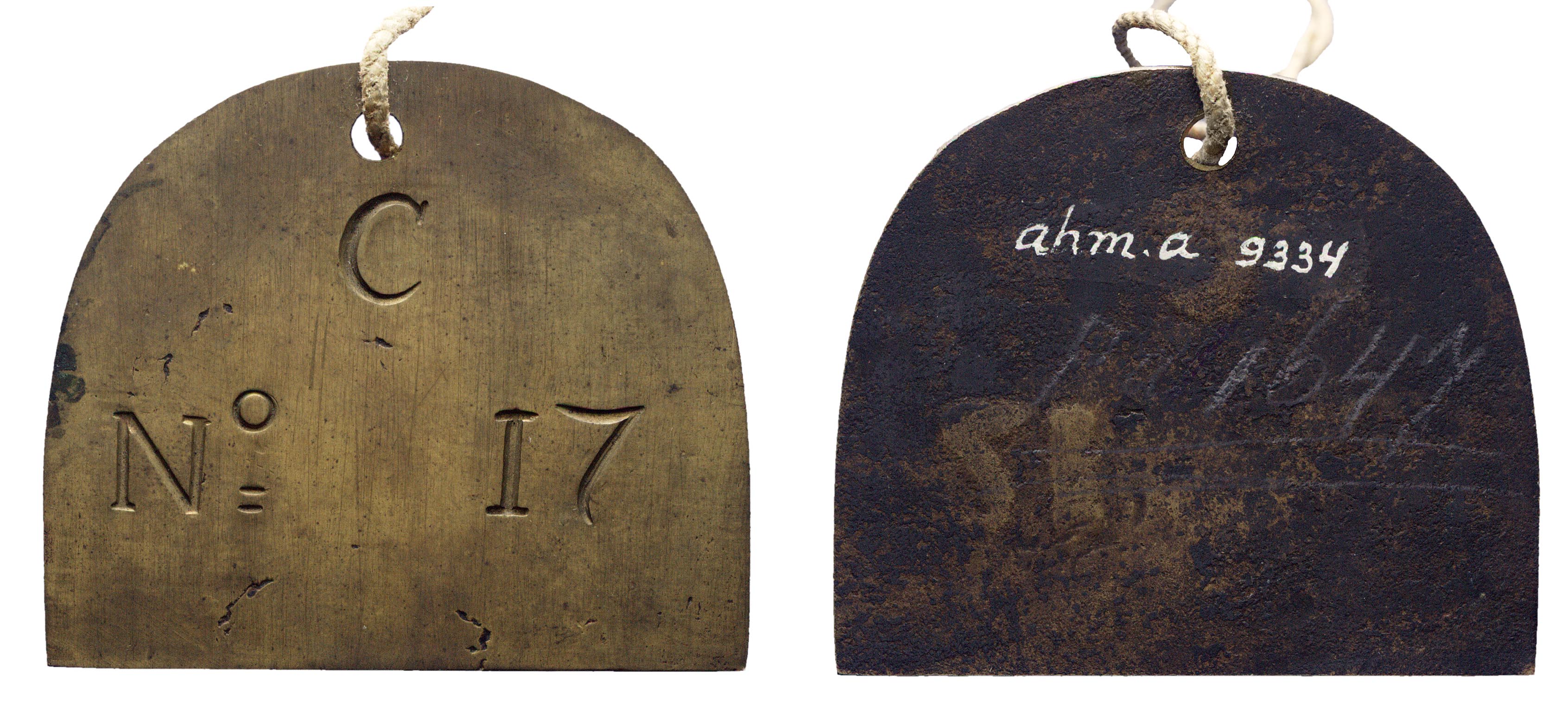 voorzijde: halfronde penning met ingeslagen letter en nummer. Bovenin een gat. keerzijde onbewerkt.- Trefwoorden