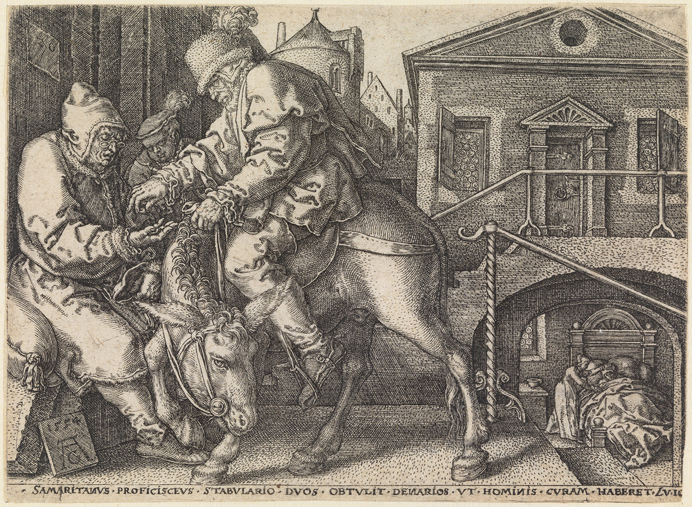 - Hij gaf twee penningen aan de waard (lucas 10 : 35) (nr. 4 uit de serie: De gelijkenis van de barmhartige Samaritaan), 1554