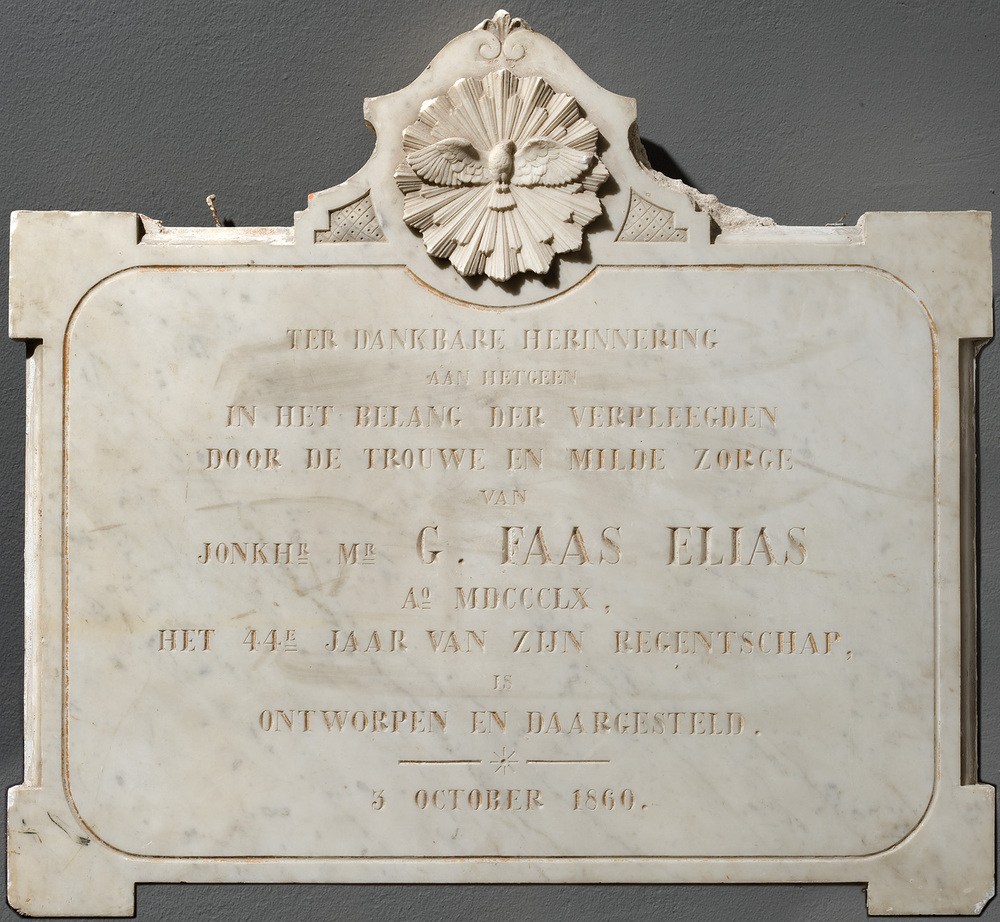 In het Amsterdamse Burgerweeshuis konden kinderen van Amsterdamse poorters (burgers met rechten om in de stad te wonen) terecht, die geen ouders of een moeilijke thuissituatie hadden. Het algemene bestuur van het Burgerweeshuis was in handen van zes regenten en vier regentessen. Hoewel zij regelmatig in het weeshuis aanwezig waren, elk met eigen vergaderruimten in het gebouw, zullen vooral de regenten voor de kinderen beperkt in beeld zijn geweest. De Amsterdamse jonkheer Gerbrand Faas Elias (1784-1864) was vanaf 1816 regent van het weeshuis. Onder zijn regentschap kwam er rond 1860 een grote verbouwing gereed. De marmeren gedenkplaat herinnert aan deze gebeurtenis, met de tekst: ‘Ter dankbare herinnering / aan hetgeen / in het belang der verpleegden / door de trouwe en milde zorge / van Jonkhr. Mr. G. Faas Elias / Ao MCCCLX / het 44e jaar van zijn regentschap / is / ontworpen en daargesteld / 3 october 1860.’ ( Sarah Remmerts de Vries)