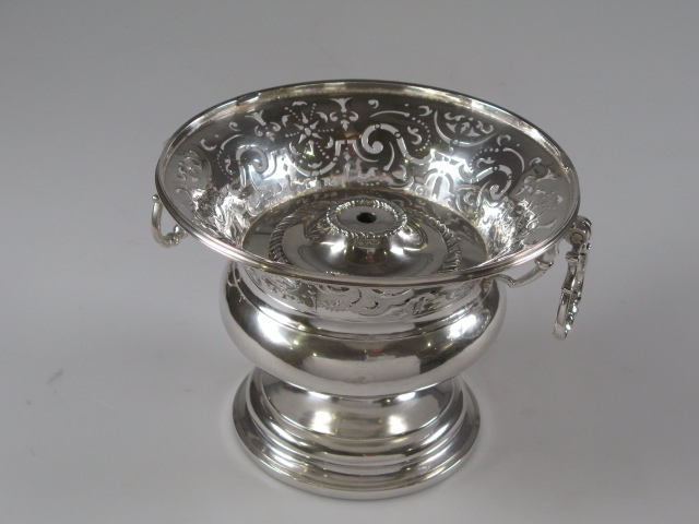 Komfoor op gewelfde voet en geprofileerde randen. Voet overgaand in gewelfd lichaam met uitstaande rand, opengewerkt met symmetrisch patroon van C-voluten en gestileerde ranken. Twee voluutvormige aanzetten met scharnierende grepen, samengesteld uit C-voluten. Losse, cilindrische brander met verhoogd middendeel en twee randen met godrons.