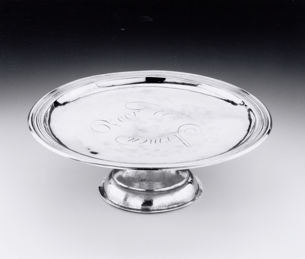Ronde zilveren presenteerschaal op gewelfde voet. Voet overgaand in diabolovormige stam. Vlakke schaal met opgelegde profielranden. Op middenveld is rondom gegraveerd: voor den Armen/.