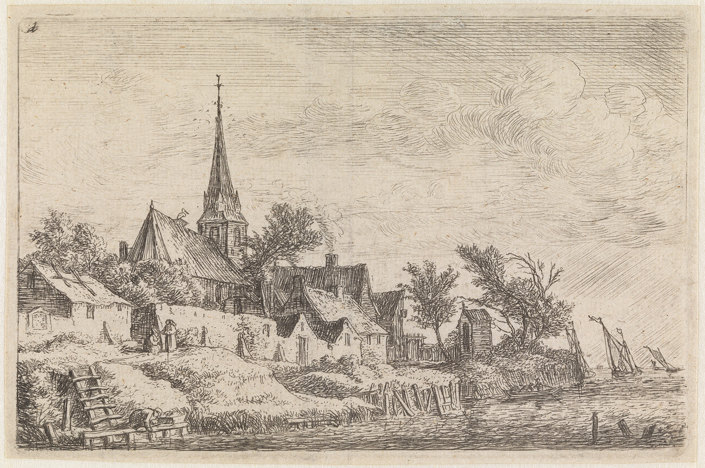 - Dorpje met een kerk met spitse toren, aan de oever van de zee (nr.4 uit een serie van 12 prenten), 1629 - 1690