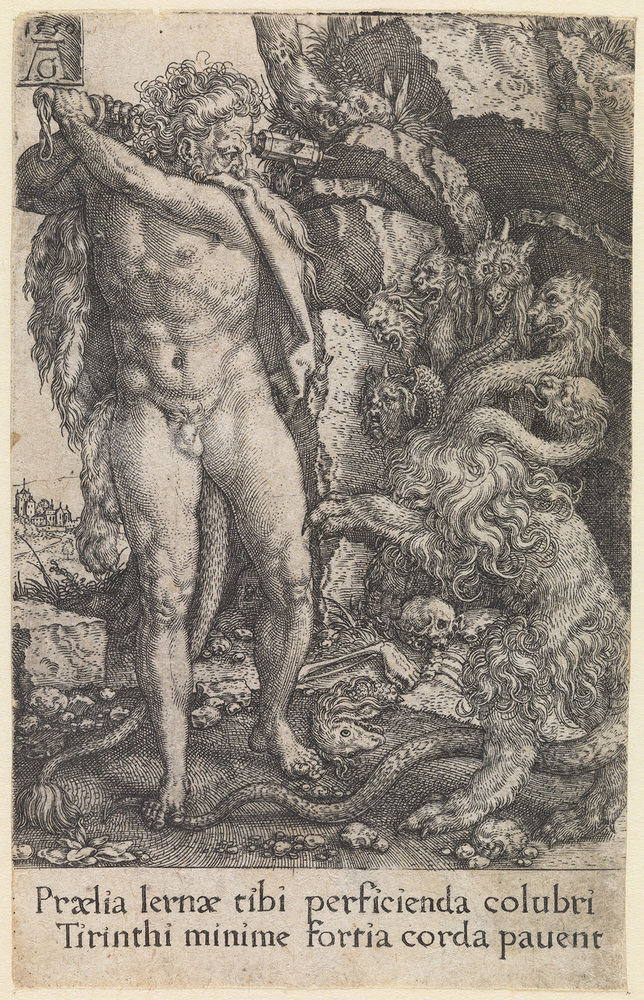 onderschrift midden onder de plaat: Praelia lernae tibi perficienda colubri / Tirinthi minime fortia corda pauent - legaat 1895