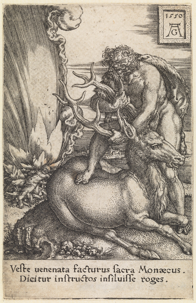opschrift onder het beeld in de plaat: Veste vuenenata facturus sacra Monaecus Dicitur instructos insiluisse roges - onbekende verwerving