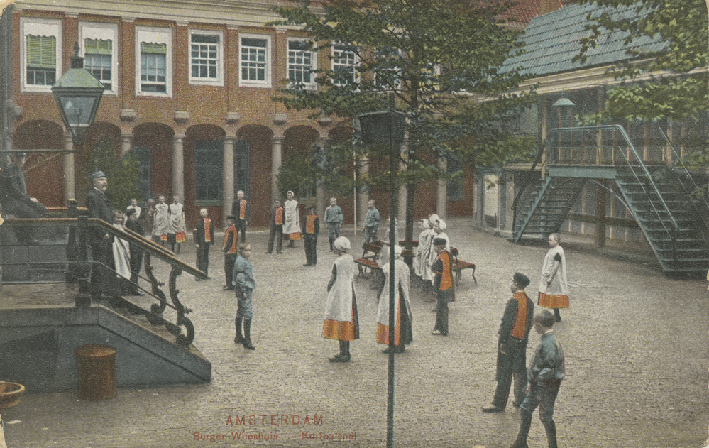 In het Amsterdamse Burgerweeshuis konden kinderen van Amsterdamse poorters (burgers met rechten om in de stad te wonen) terecht, die geen ouders of een moeilijke thuissituatie hadden. Het weeshuis was eeuwenlang een gesloten instelling, waar buitenstaanders niet zomaar naar binnen mochten. Voor de creatie van een fotoalbum, ter ere van het 25-jarige huwelijk van bouwkundige Pieter Heyn in 1904, werd een uitzondering gemaakt. Fotograaf August Stap maakte een unieke serie foto’s van het interieur, de wezen en het personeel van het Burgerweeshuis. Op de foto’s zijn de Burgerwezen tijdens hun dagelijkse bezigheden te zien. Zo komen onder meer de naailes voor meisjes, het ‘Slöjd’-onderwijs voor jongens en de zondagse gang op weg naar de kerk voorbij. Een groot aantal van de foto’s zijn later gebruikt voor de productie van een serie ansichtkaarten in kleur, waaronder deze ansichtkaart van burgerwezen op de jongensbinnenplaats. ( Sarah Remmerts de Vries)