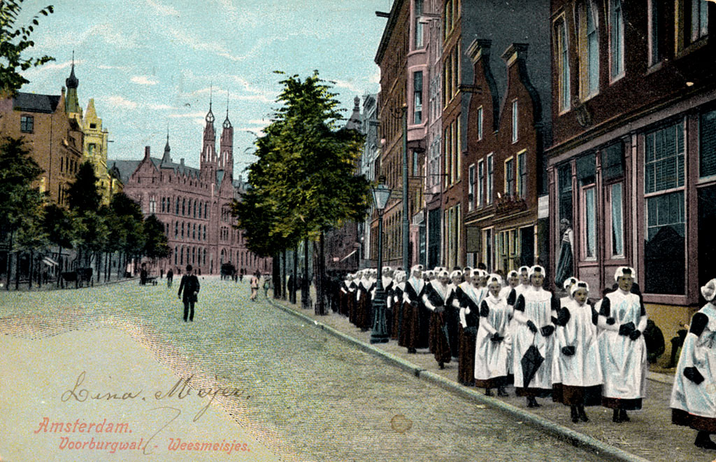 In het Amsterdamse Burgerweeshuis konden kinderen van Amsterdamse poorters (burgers met rechten om in de stad te wonen) terecht, die geen ouders of een moeilijke thuissituatie hadden. Het weeshuis was eeuwenlang een gesloten instelling, waar buitenstaanders niet zomaar naar binnen mochten. Voor de creatie van een fotoalbum, ter ere van het 25-jarige huwelijk van bouwkundige Pieter Heyn in 1904, werd een uitzondering gemaakt. Fotograaf August Stap maakte een unieke serie foto’s van het interieur, de wezen en het personeel van het Burgerweeshuis. Op de foto’s zijn de Burgerwezen tijdens hun dagelijkse bezigheden te zien. Zo komen onder meer de naailes voor meisjes, het ‘Slöjd’-onderwijs voor jongens en de zondagse gang op weg naar de kerk voorbij. Een groot aantal van de foto’s zijn later gebruikt voor de productie van een serie ansichtkaarten in kleur, waaronder deze ansichtkaart van weesmeisjes op de Nieuwezijds Voorburgwal. Waarschijnlijk keren de meisjes terug van het zondagse kerkbezoek. In de achtergrond is het Hoofdpostkantoor (het huidige Magna Plaza) zichtbaar. ( Sarah Remmerts de Vries)