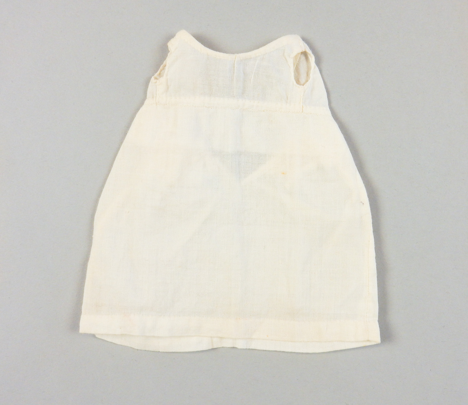 Kort mouwloos lijfje van katoen op (achter) ingerimpeld rokje. Lage ronde hals. Achtersluiting: koordjes door hals en middel.
