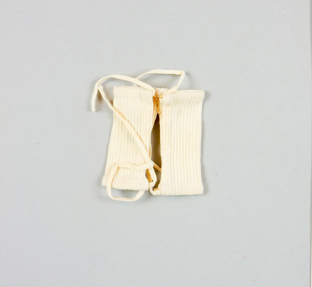 Rechte, open onderbroek met halverwege geopende binnennaden. Bovenaan en door de rechte pijpjes een linnen bandje als sluiting.