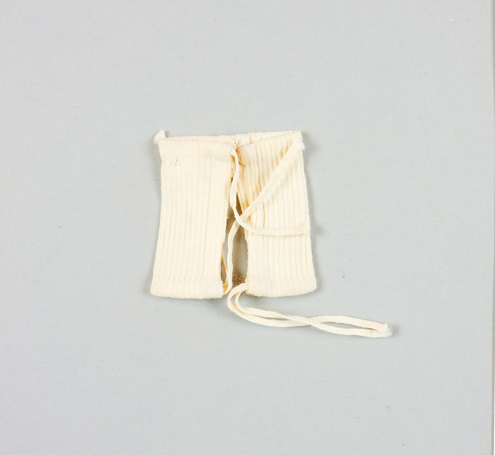 Rechte, open onderbroek met halverwege geopende binnennaden. Bovenaan en door de rechte pijpjes een linnen bandje als sluiting.