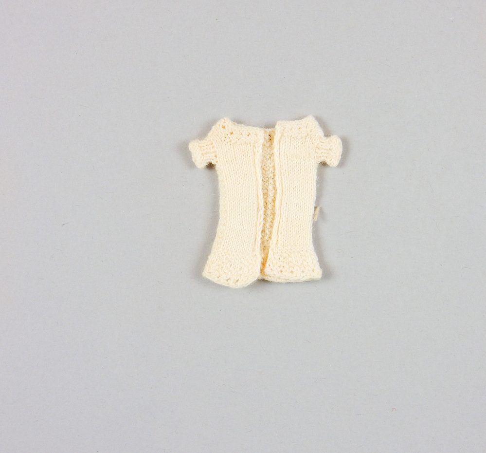 Vóór geopend jakje van katoen. Wijde ronde hals. Korte rechte mouwtjes in ander soort breisteek gebreid, afgezet met boordjes. Langs hals en onderrand gaatjes. De brede onderrand is verder gebreid in visgraatmotief, dito baan in het midden van het achterpand. De zijnaden zijn aangegeven door halve visgraatsteek.