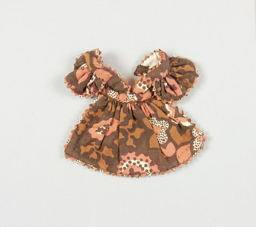 Driehoekig schortje van katoen met schuine bretels, waartegen schouderflapjes (epauletten). Het schortje is ruim gerimpeld op bandje a.h. middel, dat achter gesloten wordt. De ronde flapjes zijn ingerimpeld op de bretels. Het geheel is afgewerkt met picótje van hetzelfde materiaal als versiering. Aan de achterkant gevoerd met wit voerinkje langs de randen, dito voering langs de gehele bovenkant.
