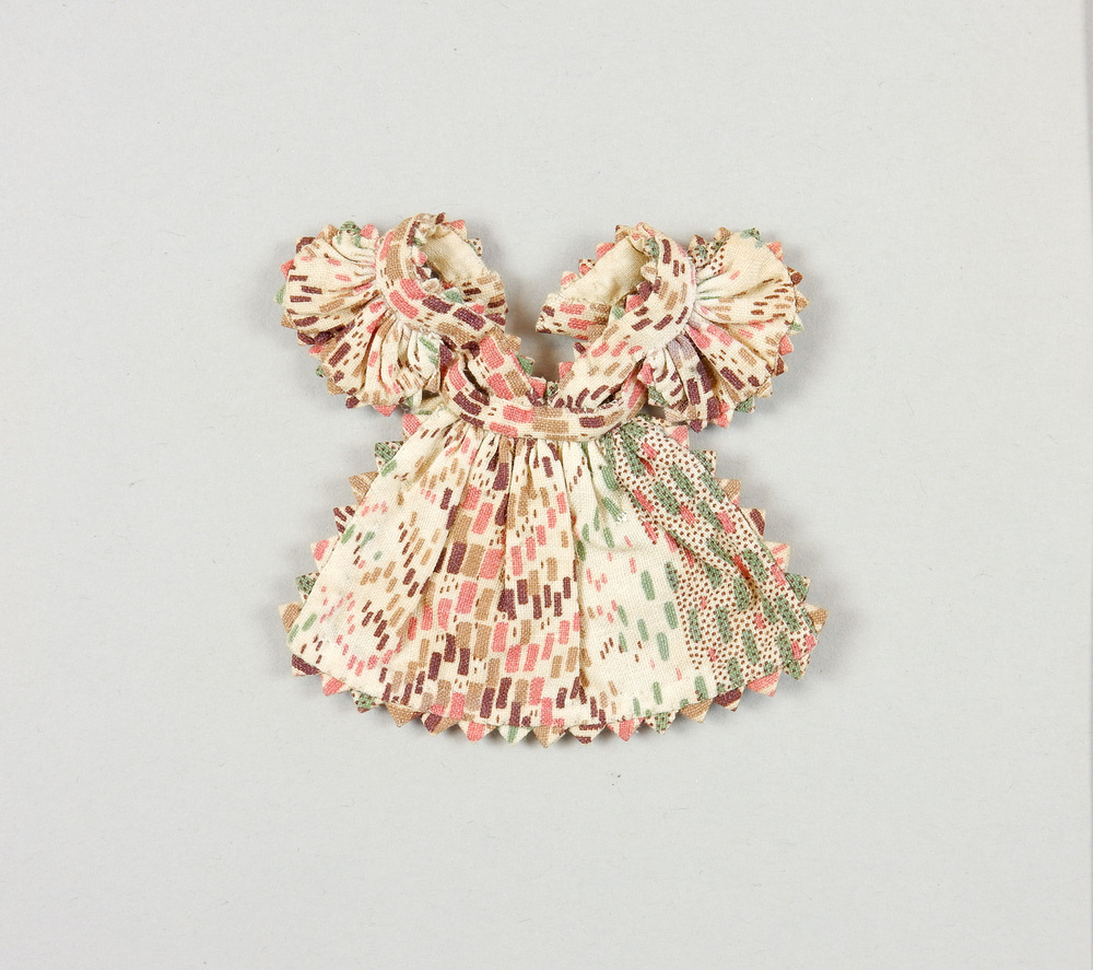 Driehoekig schortje van katoen, met schuine bretels, waartegen schouderflapjes (epauletten). Het schortje is ruim ingerimpeld op bandje a.h. middel, dat achter gesloten wordt. De ronde flapjes zijn ingerimpeld op de bretels. Het geheel is afgewerkt met een picótje van hetzelfde materiaal, als versiering. Aan de achterkant gevoerd met wit voerinkje langs de randen en bovenstukje.