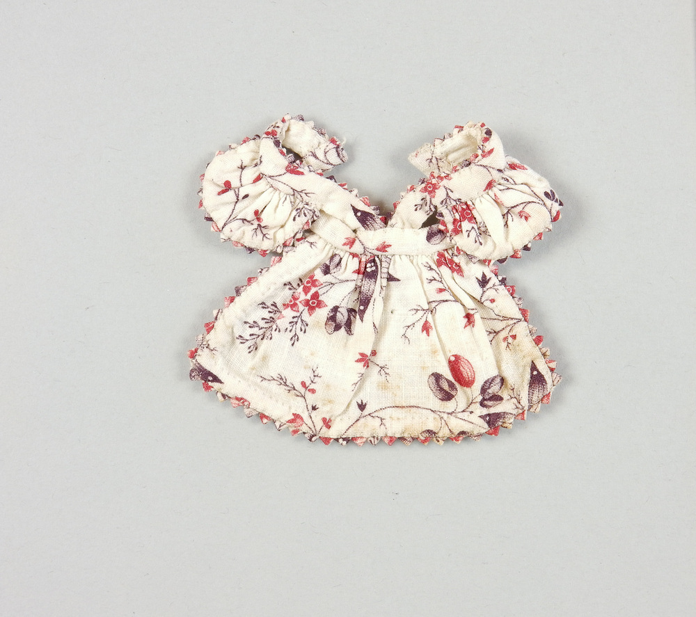 Wijd uitstaand schortje van katoen, bij 't middel ingerimpeld op bandje, waarop schuine bretels met ronde, ingerimpelde schouderflapjes (epauletten). De bretels lopen vanuit het midden naar de schouders toe. Het geheel is afgewerkt met picótje van hetzelfde materiaal, als versiering. Aan de achterkant gevoerd met wit voerinkje langs de randen en 't bovenstuk.