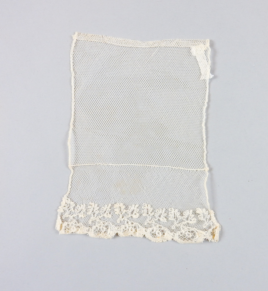 Het tulen spreitje heeft een geborduurde rand met florale motieven van doorgestopte kant, waarvan de rand is uitgeschulpt. De andere randen zijn met de hand omgenaaid en gezoomd. Op ± 5 cm van de geschulpte rand loopt een genuanceerde streep (wit), waarschijnlijk om de overslag aan te geven van de geborduurde omslag.