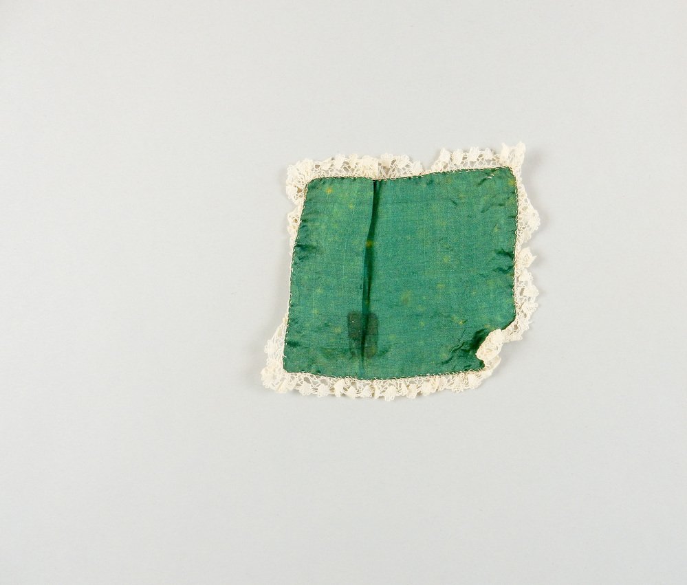 Siersprei van groene zijde gevoerd met witte batist. Vierkant model, afgezet met katoenen kloskant.
