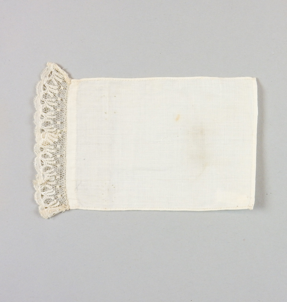 Met de hand gezoomd langwerpig lapje van linnen (?). Afgezet aan een kant met een doorgestopt kantje met geschulpte rand, in geometrische (?) motiefjes.