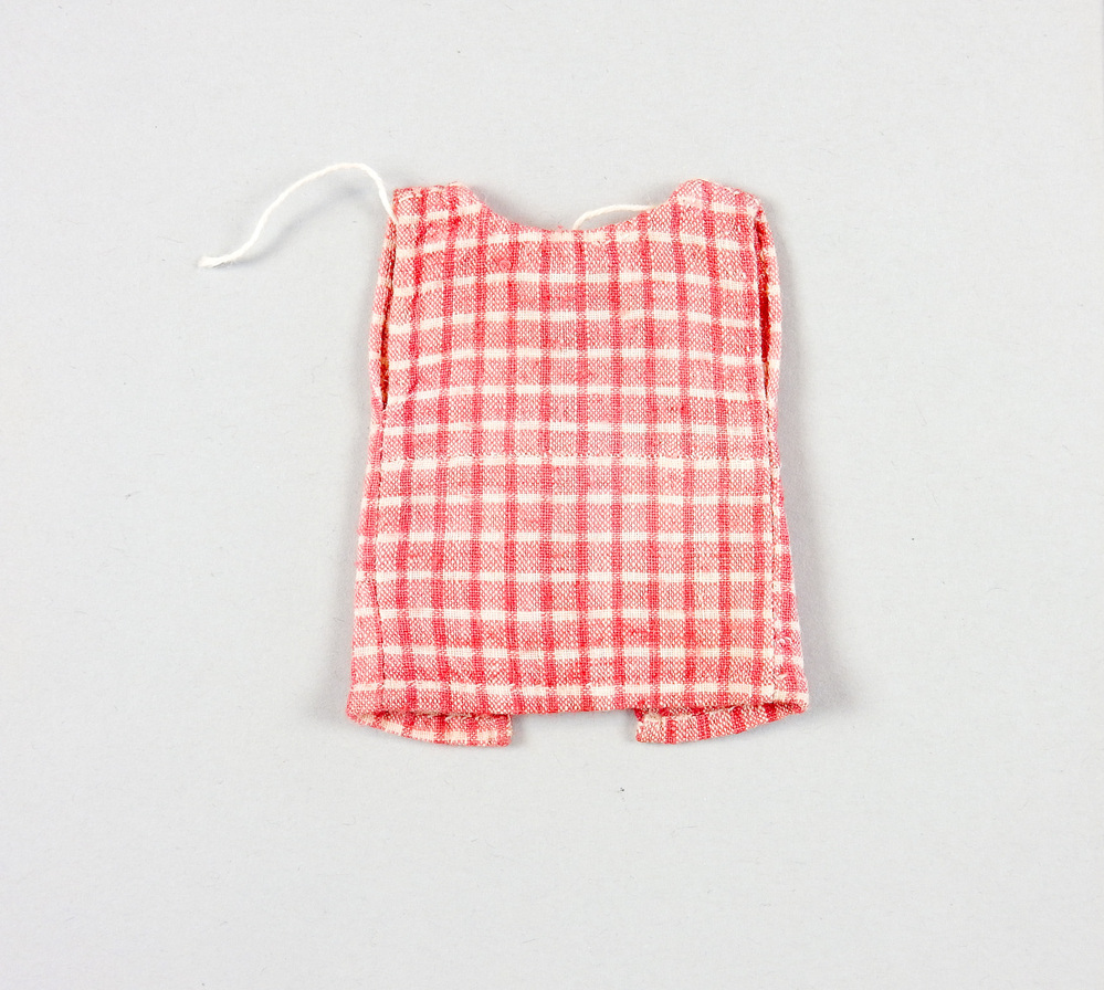 Recht jakje zonder mouwen van wit katoen met ingeweven rode ruit. Achter open. Door de hals is een wit koordje gehaald, als sluiting.