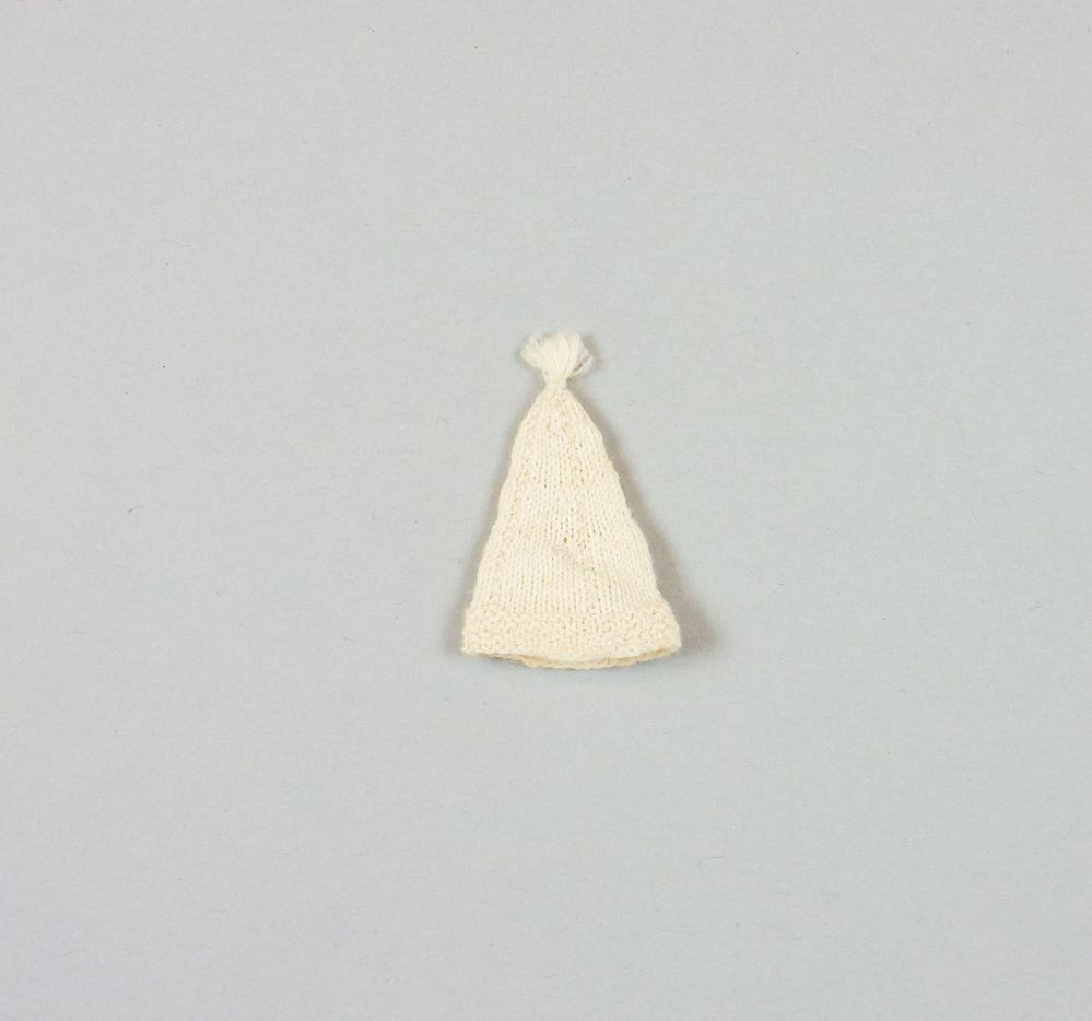 Puntmutsje van katoen met kwastje bovenop. De onderrand is in gerstekorrelsteek gebreid. Versierd met verticale naadjes overlangs.