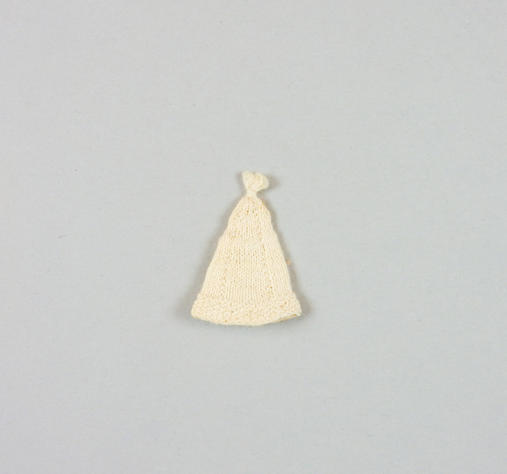 Puntmutsje van katoen met kwastje bovenop. De onderrand is in gerstekorrelsteek gebreid. Versierd met verticale naadjes overlangs.