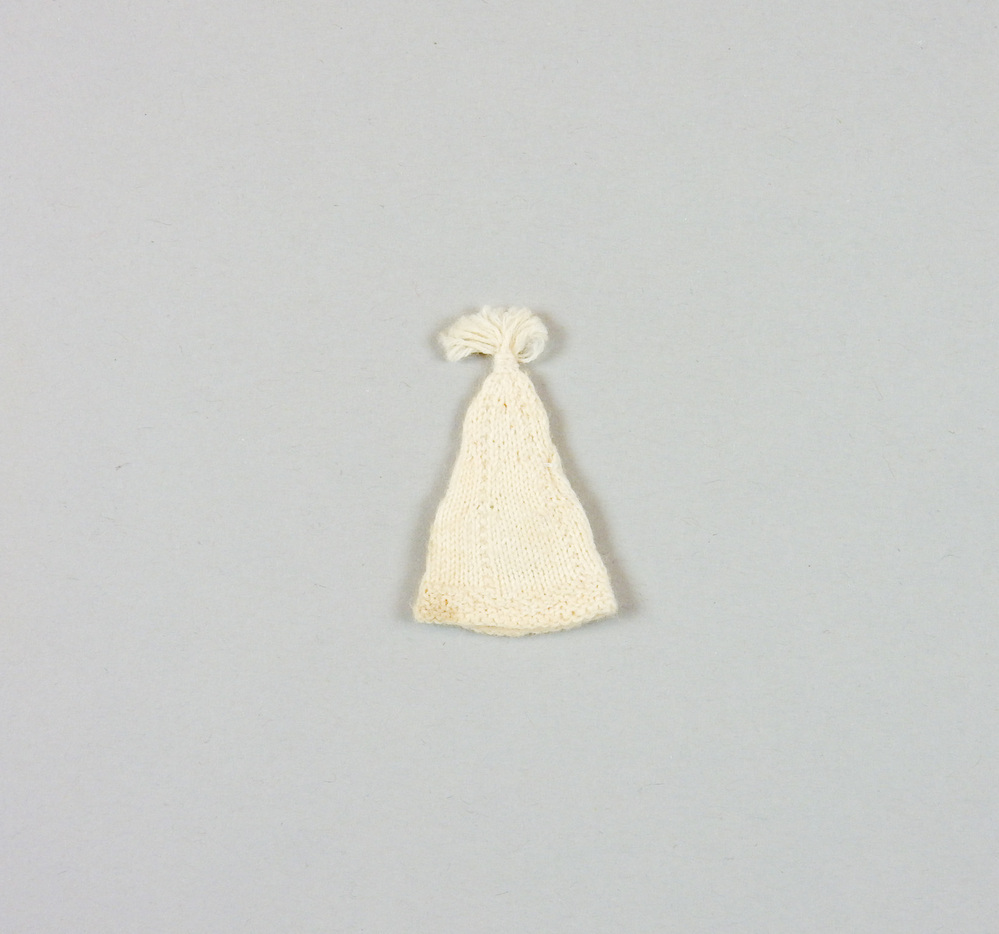 Puntmutsje van katoen met kwastje bovenop. De onderrand is in gerstekorrelsteek gebreid. Versierd met verticale naadjes overlangs.