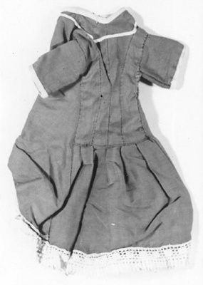 Lichtblauwe linnen tuniek of overjapon van linnen. Achter op laag aangezette taille door 3 naadjes in de rug getailleerd, Daardoor onder de taille wijd uitlopend achter. Vóór gesloten door 3 haakjes en witte trensjes. Voorzijde glad en sterk gérend naar onderen. Korte rechte mouwtjes (aangeknipt). Deze zijn omgeboord met wit band, dito band geboord langs de hoog gesloten hals en als garnering langs de beide voorkanten en gedeeltelijk langs de onderrand. Dito band als kraagvormige pas achter de hals. De onderrand is afgezet met een wit katoenen gehaakte passement-strook.