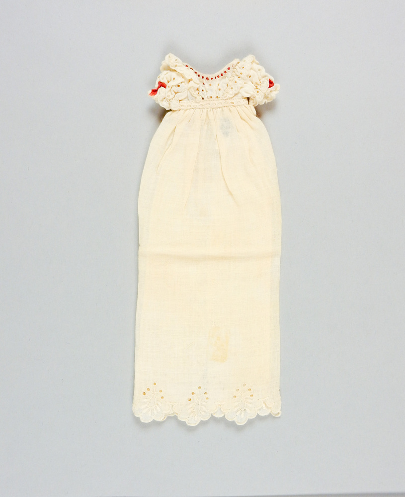 Het korte lijfje en de lange rok van fijn katoen zijn ingerimpeld op geborduurd bandje bij 't middel (gaatjes). Wijde boothals, achter door rood lint ingehaald door geborduurd schuifje met gaatjes. Dito lintjes als strikjes-versiering op de zeer korte pofmouwtjes, deze eindigen in geborduurd, ingerimpeld randje. Rond de hals een kraagje, dat langs het geborduurde plastron tot 't middel puntig doorloopt (van ajour-borduursel). Dito borduursel aan de mouwtjes en kraagje, de rok heeft als enige versiering een geschulpte, gefestonneerde rand onderaan, opgevuld met rozetjes in open en dicht borduursel.