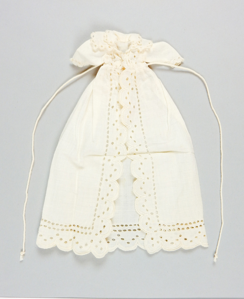 Vóór geopende doopjurk van fijn katoen, effen, met langs de gehele vóór-opening en onderrand een rand van Engels borduurwerk als versiering. Verder dito borduursel langs de dubbele pelerine kraag en als manchetje. Het borduursel heeft overal een uitgeschulpte, gefestonneerde rand. De sluiting door een wit koordje is door het middel gehaald en wordt om dichtgestrikt. De mouwtjes zijn halflang en glad en eindigen zeer smal, zijn kopmouwtjes. De voorkant van het korte lijfje is met gaatjes geborduurd.