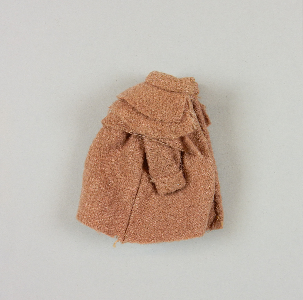 Pelerine manteltje van wol (mantelstof) en zijde (voeringbandje) met dubbele pelerinekraag en opstaand halsboordje. In de rug een vastgehaakt, los hangend ceintuurtje, dat voor wordt dichtgestrikt. Rechte lange mouwtjes met omgeslagen manchetjes. Tegen taillenaad binnenin een wit zijden schuifje, waardoor koordje wordt gehaald als binnensluiting. Hierdoor ontstaat ruimte in de rug. Het jasje is gedeeltelijk afgezoomd, gedeeltelijk nog in de rafel.