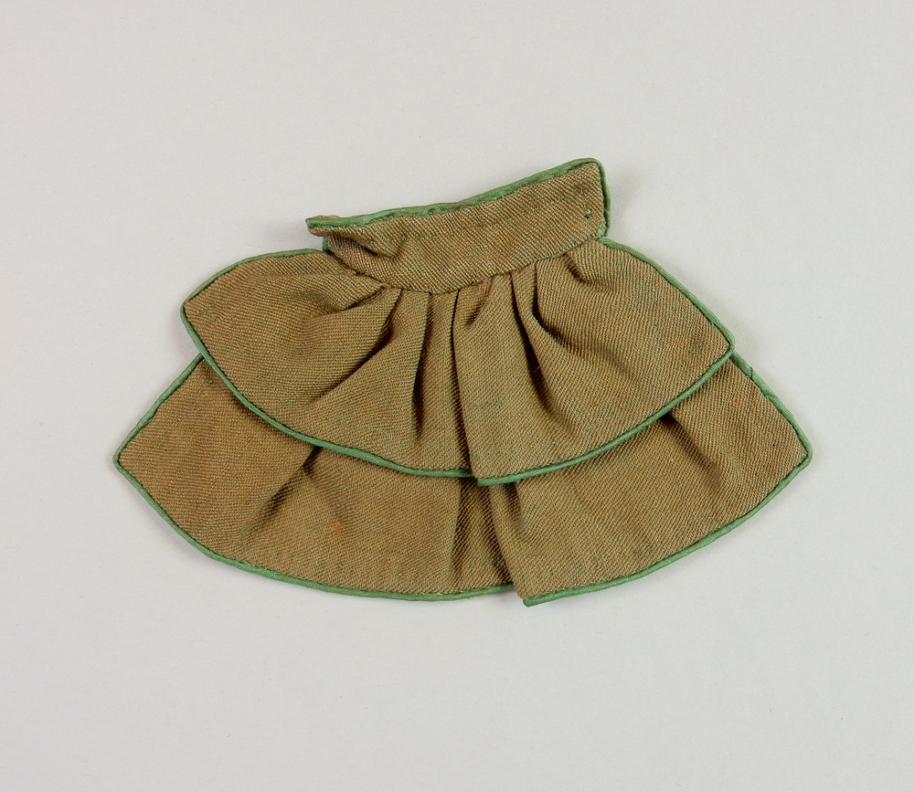 Mosgroene, zeer ruime pelerine van wol en zijde met brede pelerine kaag, langs de hals afgewerkt met teruggeslagen halsboord. Tegengevoerd met witte zijde (behalve de kraag en halsboord). Langs alle naden geboord met felgroene zijden randje. Behoort bij jurkje van 't zelfde materiaal no: KA 12293.- Trefwoorden