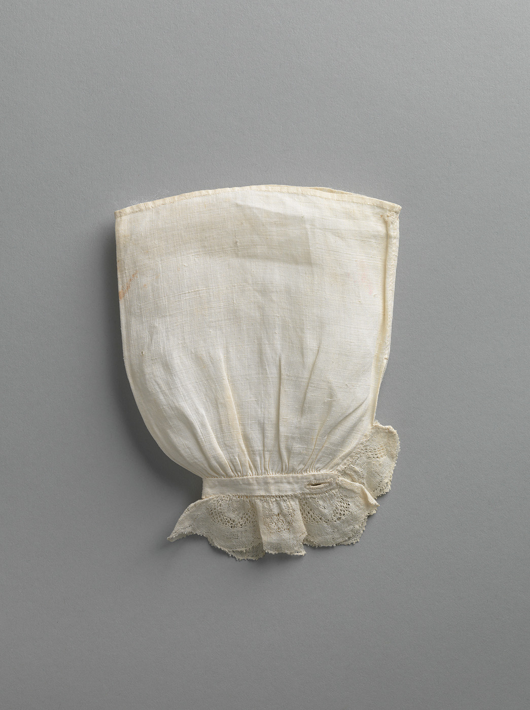 Witte linnen mouw voor een baby, voor een jongen, ingerimpeld langs manchet, afgezet met kant. Bedoeld als nette kleding.