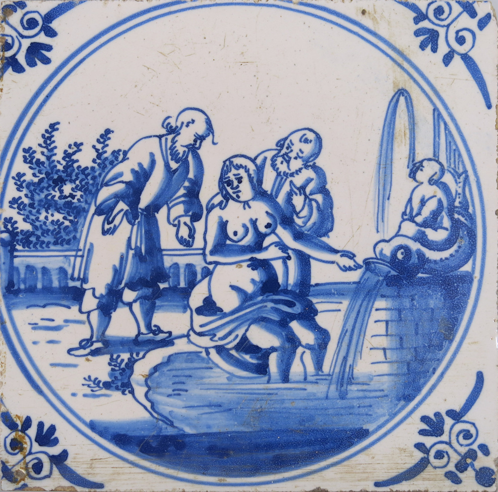 Bijbeltegels zijn zeer geliefd en gewild door de eeuwen heen. Eén daarvan toont de badende Susanna in het bijzijn van twee heren. Het verhaal van de 'kuise Susanna' behoort tot de deuterocanonieke boeken bij het Oude Testament. Daniël 13:1-64 beschrijft de benarde positie waarin de jonge vrouw verkeert. Het verhaal speelt zich af tijdens de Babylonische Ballingschap. ( Suzette van 't Hof)