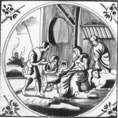 voorstelling in cirkel: aanbidding van de herders, rechts Maria, de os en Jozef
