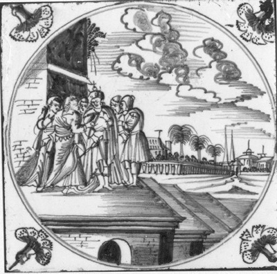 voorstelling in de cirkel: een koning met priesters en soldaten op het bordes van een paleis