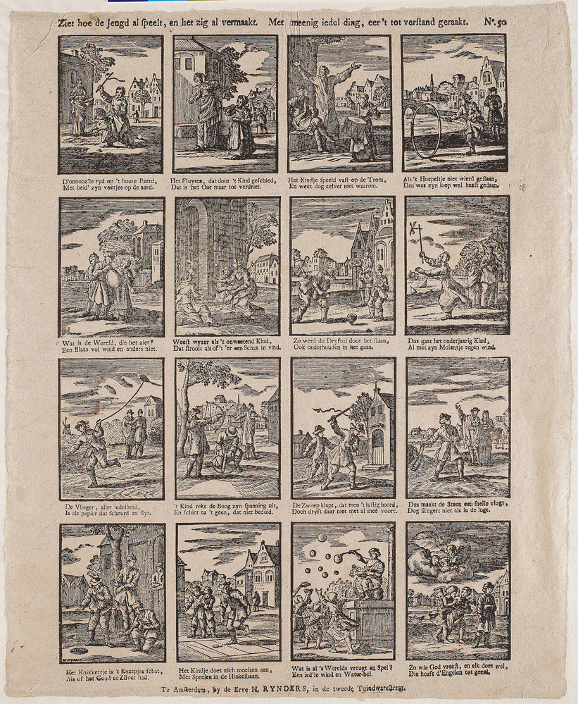Alle afbeeldingen zijn kopieën naar prenten van Jan Luyken en Pieter Sluiter. Deze prenten komen voor in Jan Luyken, des menschen Begin, Midden en Einde, Amsterdam 1712. (zie vitrine) Uit de tekst van deze kinderprent blijkt dat men het kinderspel maar als een ijdel en onnozel vermaak zag. ( Rob Jager)
