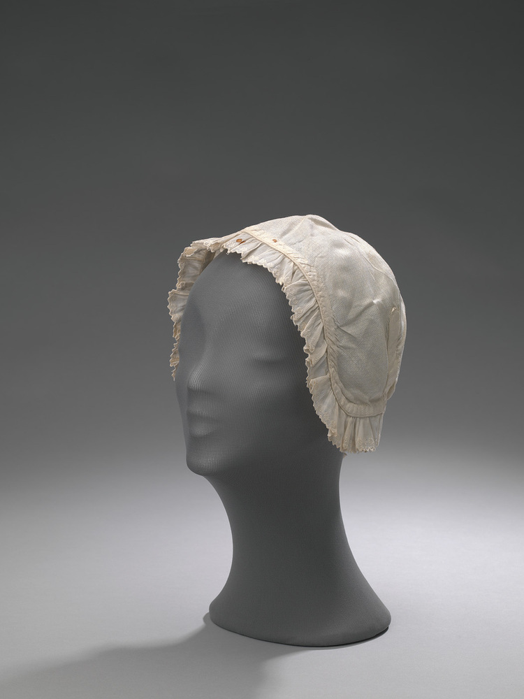 Witte katoenen nachtmuts met ingeweven wafelpatroon met gerimpelde rand van geborduurde piqué katoen. Van binnen in te halen. Initialen: HW 6. Zie ook KA 12608 en KA 12609.- Trefwoorden