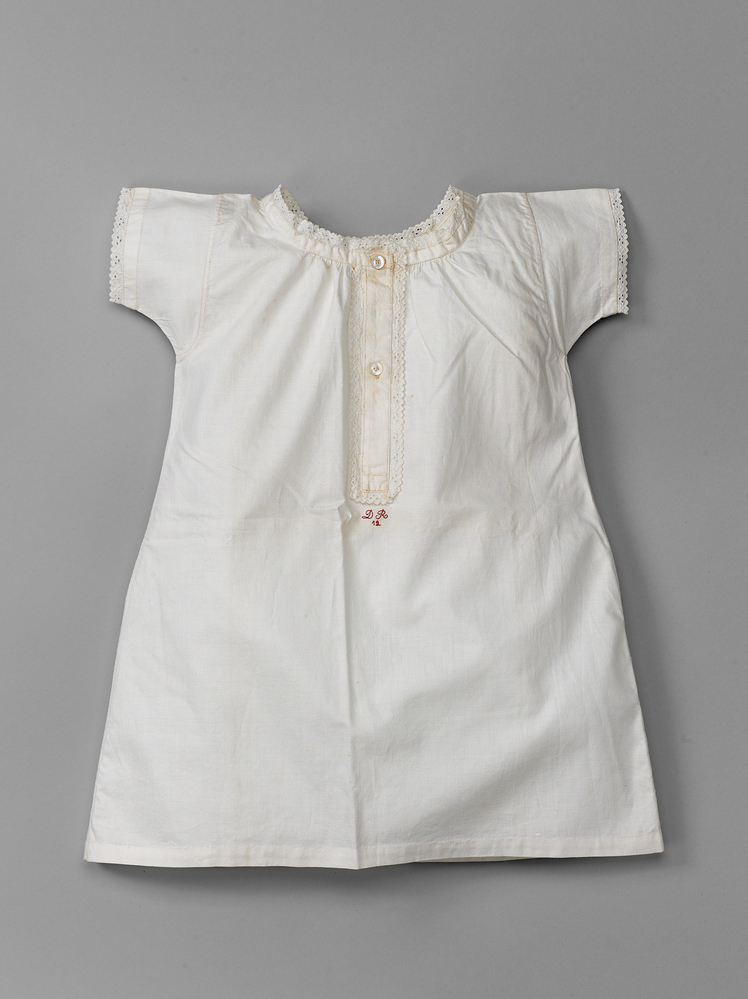 Miniatuur vrouwenhemd van wit katoen. Lang, gerend, met ingezette korte mouwen. Lage ronde hals met voorsplit (16 cm) sluitend met twee parelmoeren knopen. Hals, voorsplit en mouwen afgezet met broderie. Onder de voorsplit in rood geborduurd: “DR12”.- Trefwoorden