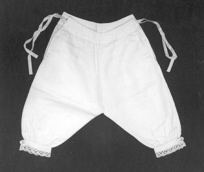 Witte, onderbroek, pofbroek model. Bovenaan broekbandje met 2 splitten opzij, sluiting: 2 linnen bandjes opzij aan beide kanten van de split. De lange pijpen zijn tegen bandje ingerimpeld en opzij aan beide kanten gesloten door parelmoren knoopje en knoopsgat en onderaan afgezet met een linnen passement kantje. Met rood gemerkt: “DR6” bij de rechter zij split.